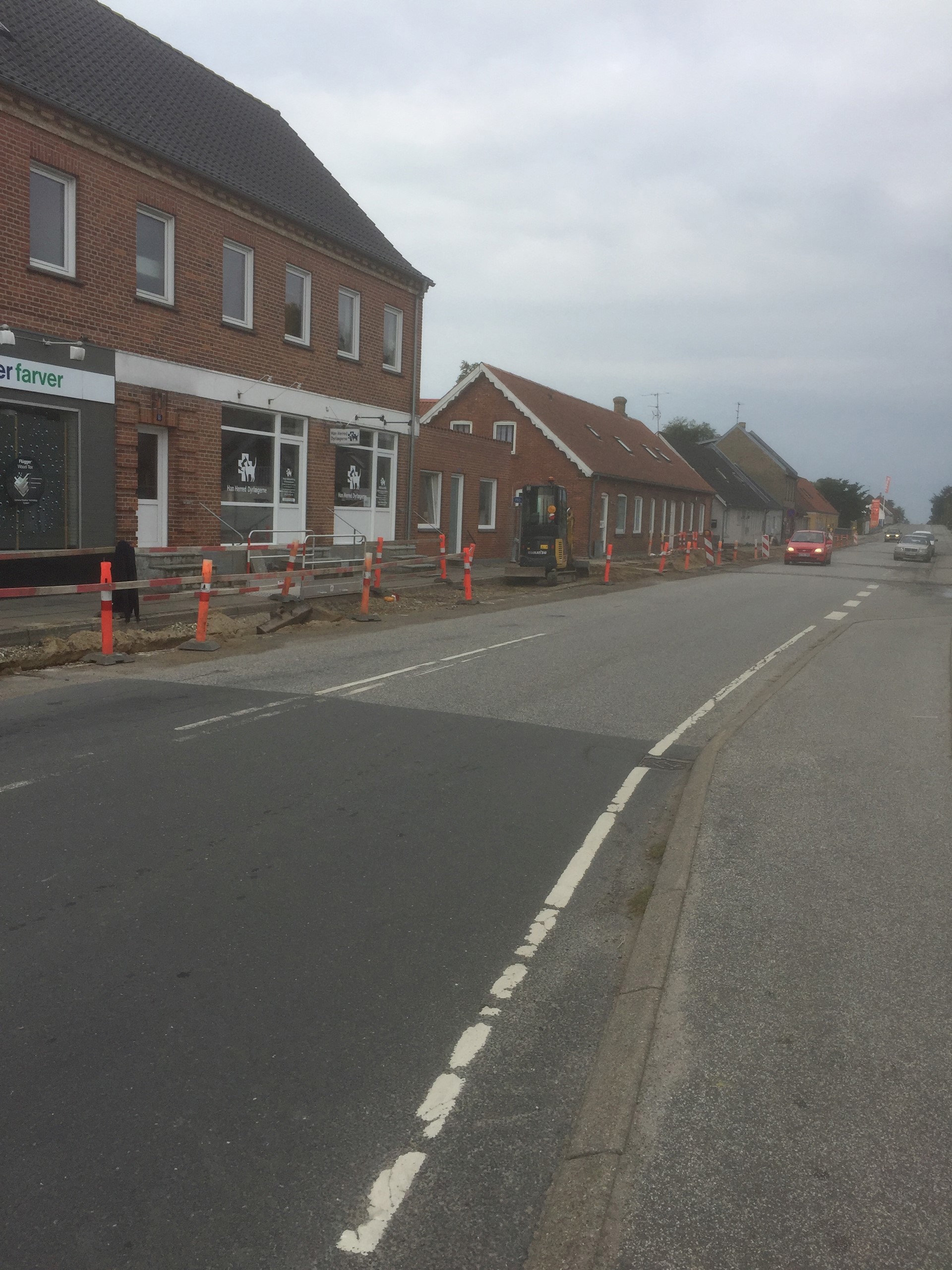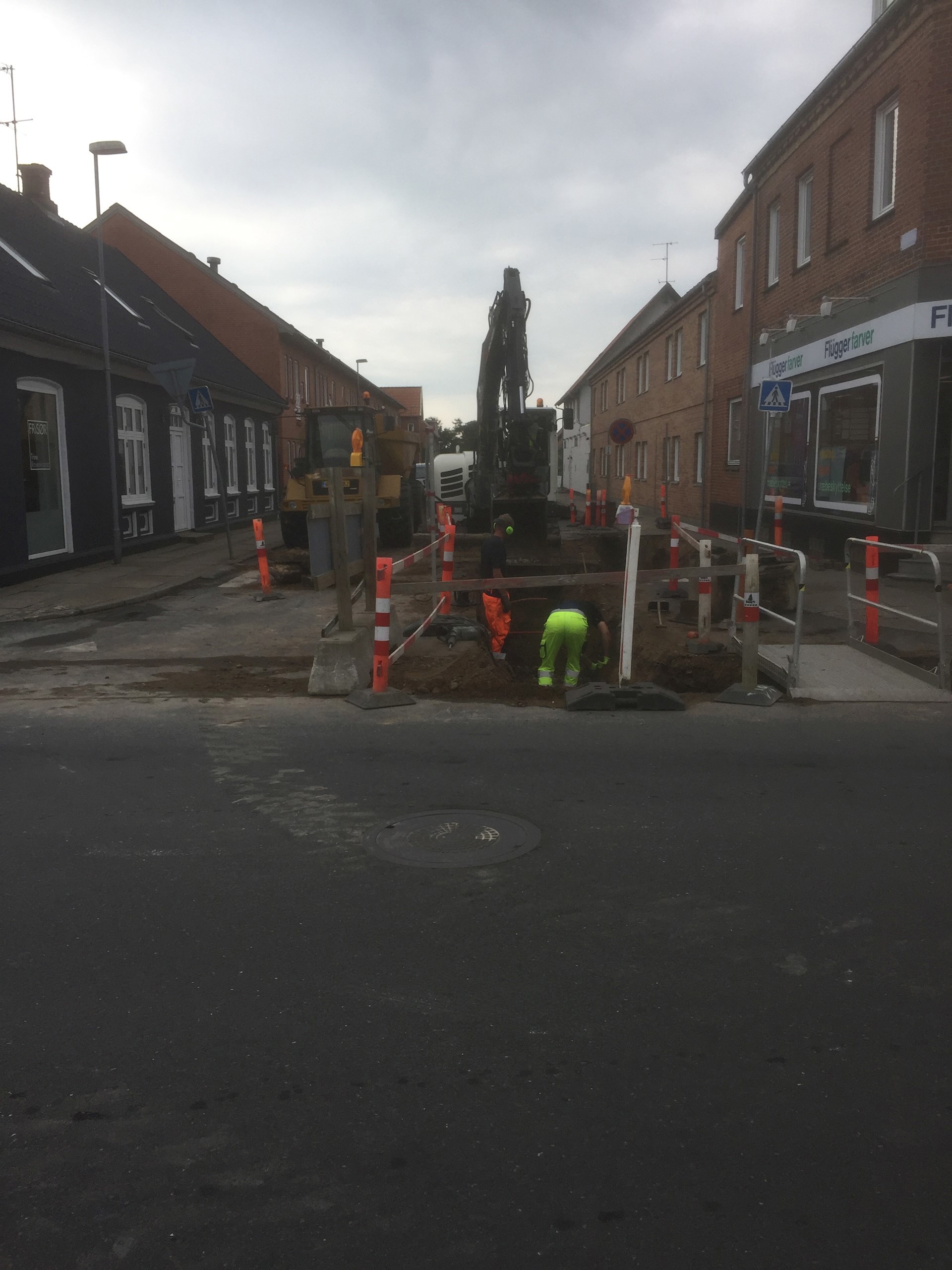 Fredag den 14. september 2018 forventer vi, at der er etableret asfalt og fortovs fliser fra Skolegade til Nygade.