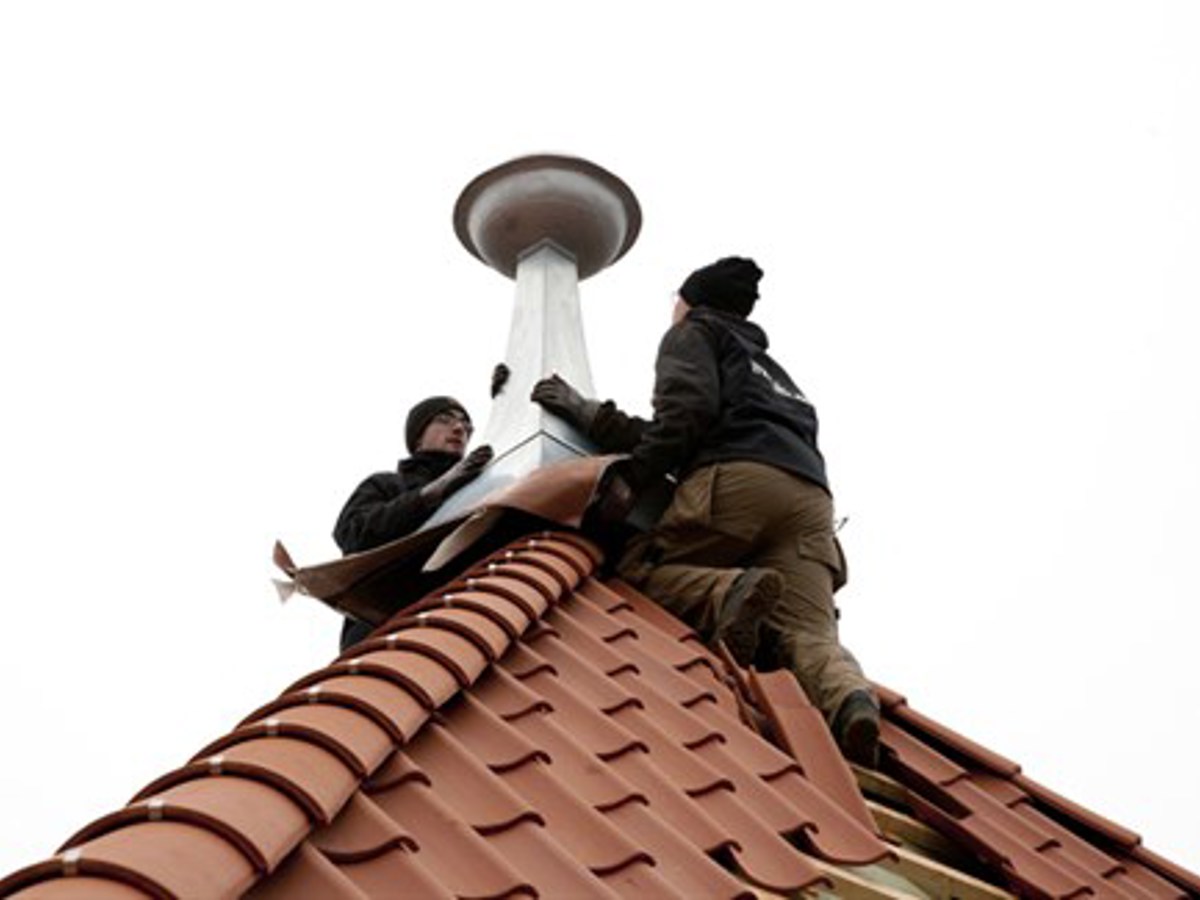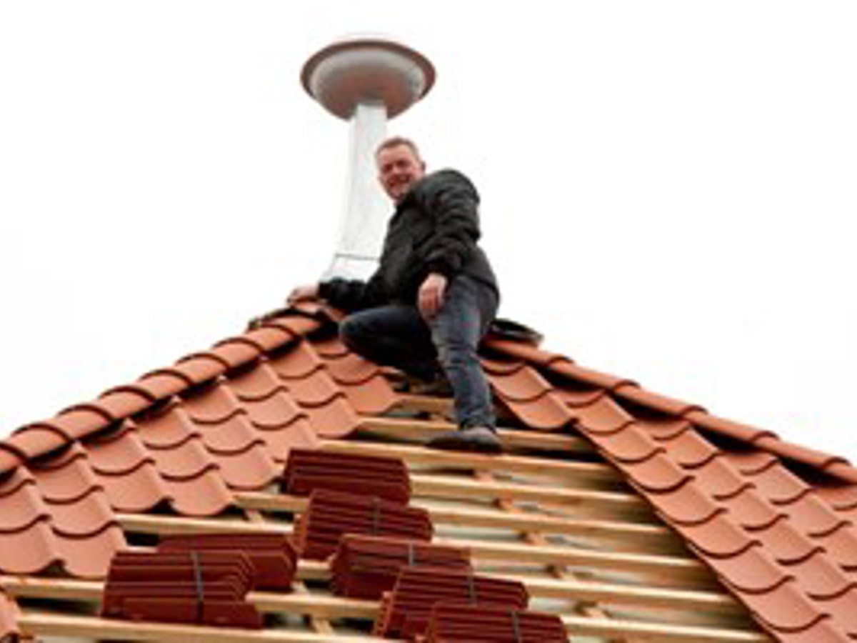 Tømrerfirmaet Allan Kær står for renoveringen af det historiske hus, og foreløbig er der lagt nyt tegl på det pyramideformede tag. Vartegnet, som har prydet toppen af taget siden opførelsen i 1913-14, er også blevet genskabt og sat på plads.